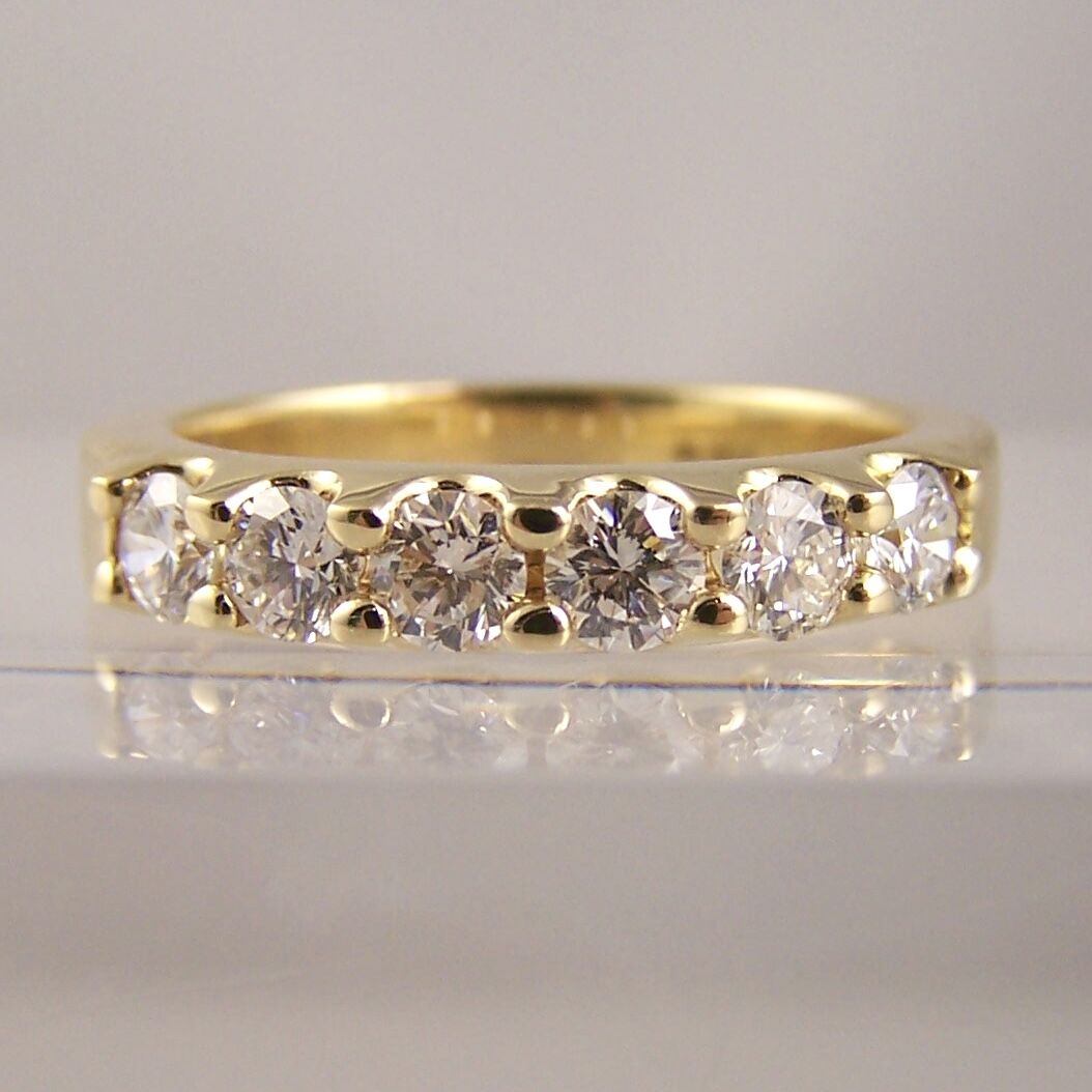 Claw set 18ct gold 6 stone wedding ring. This ring is set with six 0.10ct round, brilliant cut Diamonds giving a total carat weight of 0.60ct. The Diamonds are claw set in 18ct yellow gold.