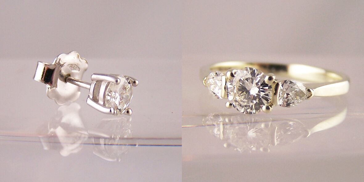 Diamond ear stud remodelled into round and pear cut diamond engagement ring. The new engagement ring was made in our ‘natural’, unplated 9ct white gold (most jewellers plate their yellowy/brown white gold with a metal called rhodium). Our natural 9ct white gold is a beautiful warm, creamy colour that is much whiter than yellow gold, but is warmer than Platinum & Palladium.