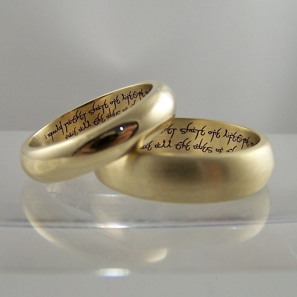 These LOTR wedding rings are made from 9ct Gold. One ring is a 5mm wide, D-shape in a brightly polished finish. The other is a 6mm wide, D-shape in a satin (matt) finish. The Elvish engraving was laser engraved inside the rings & spanned over 2 lines.