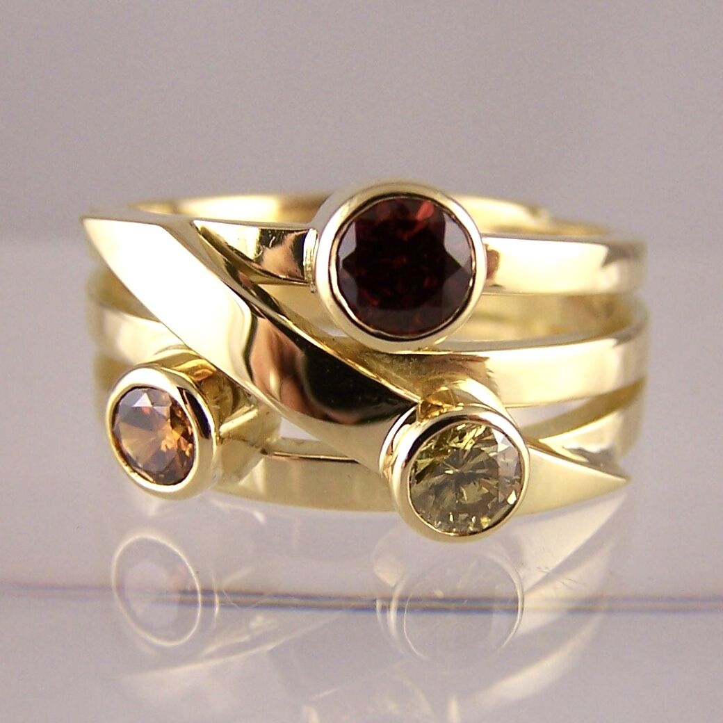 Rubover set 18ct gold Garnet and peridot strand ring.