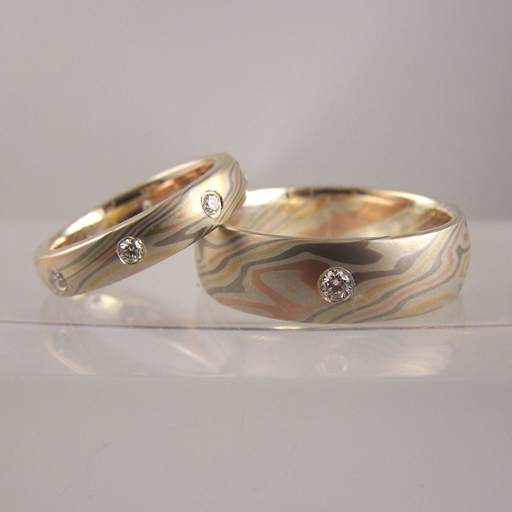Mokume Gane is an ancient Japanese metalworking technique. Mokume Gane wedding rings can be made with various precious metals, including yellow Gold, rose Gold, white Gold, Platinum & Silver. These unique rings are created by bonding layers of metal together to form a beautiful, one-of-a-kind design.