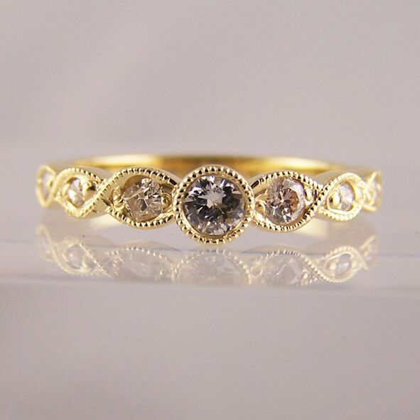 18ct yellow gold round cut diamond ring. This ring is set with 7 graduating round cut diamonds. To give it a vintage style the ring has a milgrain rope twist feature running all of the way through the diamonds.