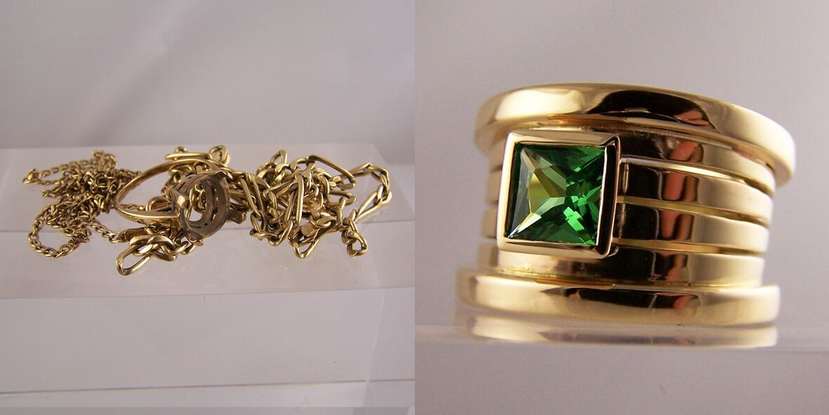 old gold chains remodelled into wide tsavorite gold ring