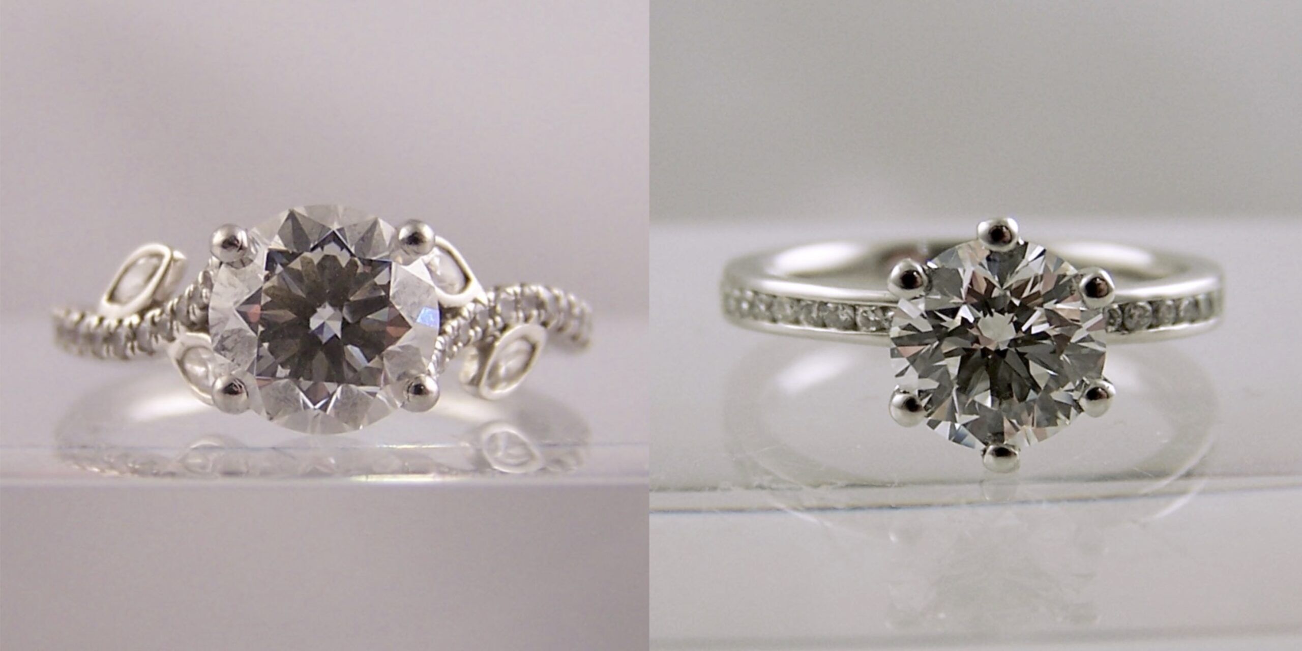 Old ring reset into 6 claw set engagement ring. For this commission we took a crossover ring with leaf details & reset it into a more classic Diamond engagement ring. The new ring featured a central 6 claw set round brilliant cut Diamond. The shoulder stone were channel set. The new ring also has a parallel shank rather than a curved one as on the original crossover design.