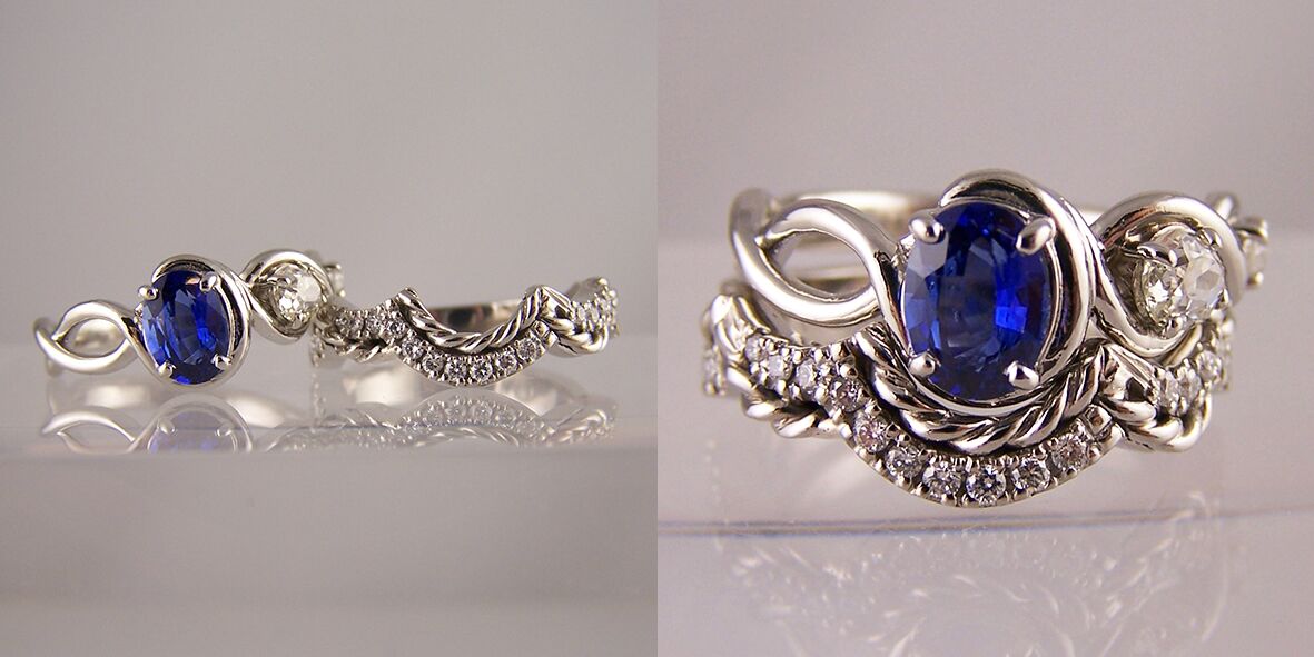 oval sapphire crossover and fitted rope twist diamond wedding ring
