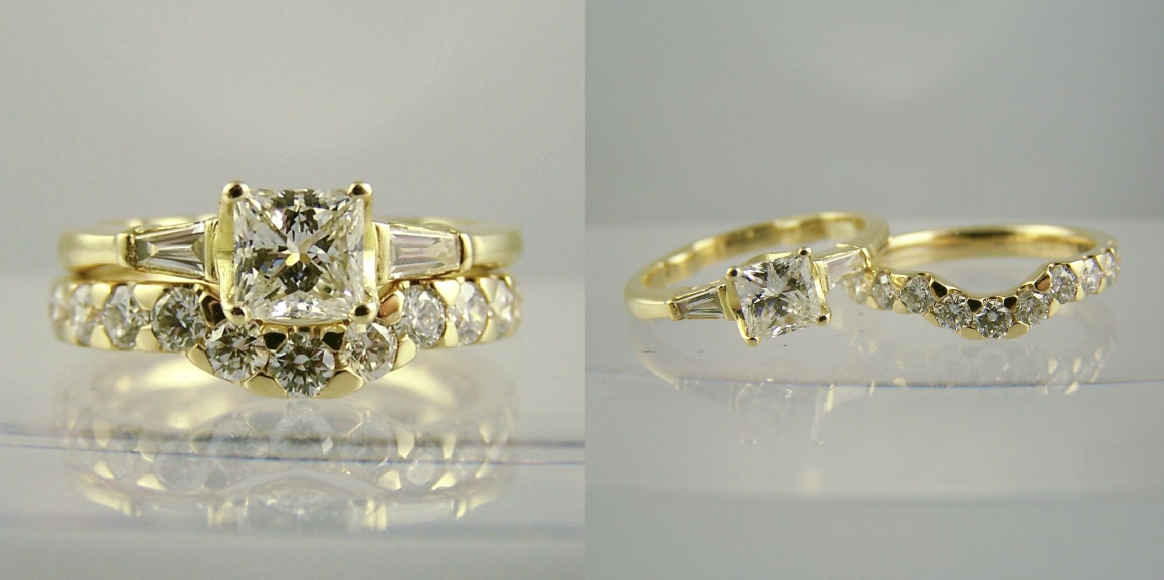 Princess & baguette cut engagement ring with with claw set shaped wedding ring