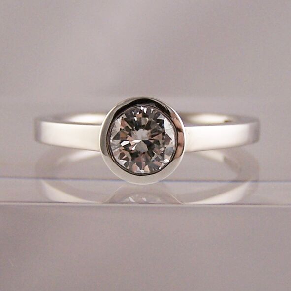Rubover set diamond ring. This ring is set with a centre stone weighing 0.60ct. The diamond is a laboratory certificated 'G' colour, 'VS1' clarity. We can also make this design to accommodate either a larger, or smaller centre stone of any grade. All of our diamonds over 0.25ct come with a GIA laboratory certificate at no extra cost.