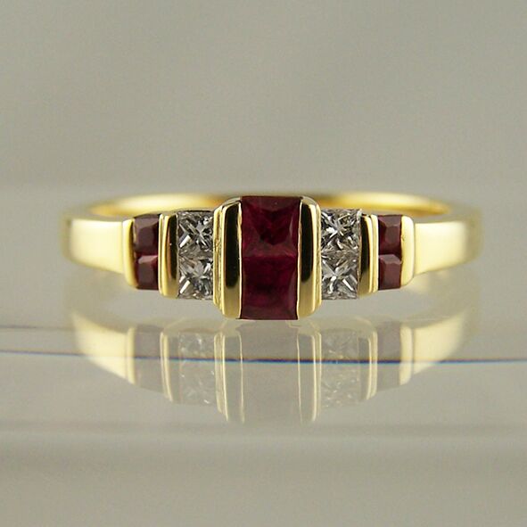 Ruby & diamond ring. This design is set with pairs of princess cut stones. The stones graduate away from the centre creating an art deco style stepped design.