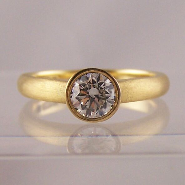The diamond in this ring is in a rubover setting. The rubover collet is brightly polished, while the shank of the ring has been given a ‘satin’ (matt) finish.