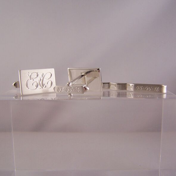 silver cufflinks & tie slide set engraved with initials & wedding date