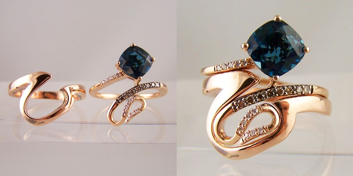 topaz and diamond asymmetrical ring with shaped rose gold wedding ring