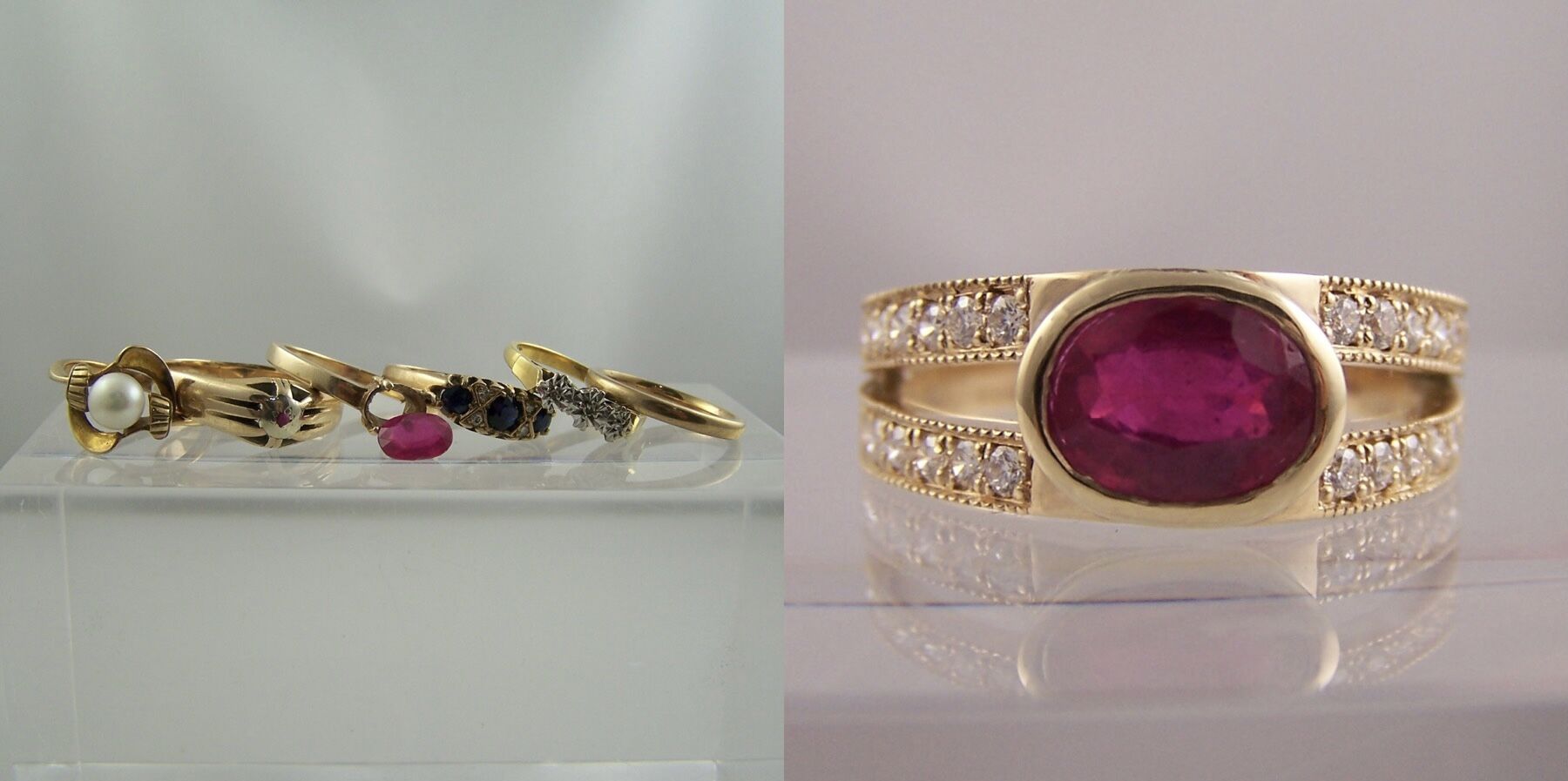 For this customer we took a selection of their old jewellery that was either damaged or unworn & unset the gemstones. We then melted the gold to make a new rubover set mount with a split shoulder design. A Ruby & some small Diamonds were then set into the new ring.